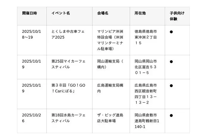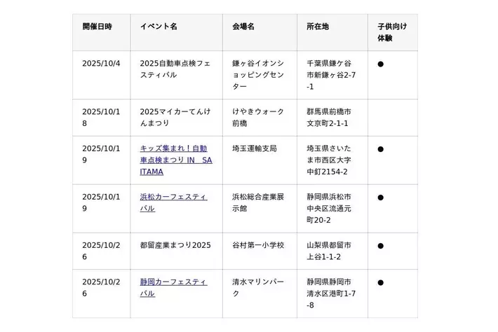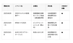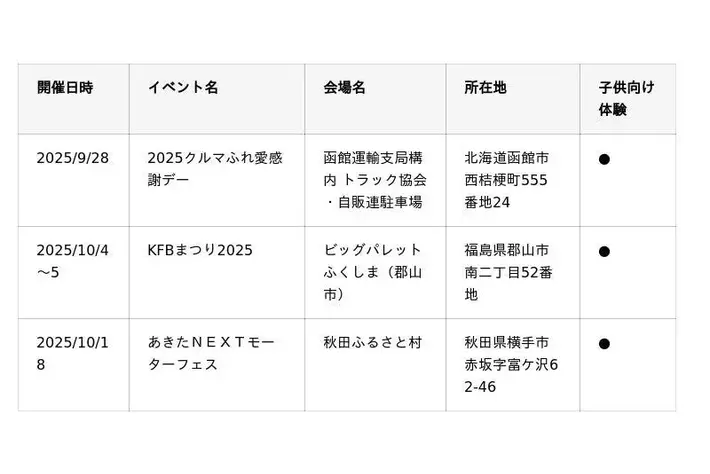 10~11月に開催するJMS 2025に加えて、各地で自動車整備イベントを開催します。未来を担う子どもたちに、クルマの世界の魅力、本物の職業体験に触れていただける子供向け体験コンテンツを用意している会場もあるので、ぜひご家族でお近くの会場に足を運んでみてください。■北海道・東北エリア