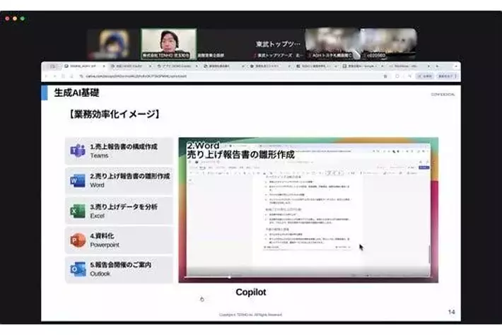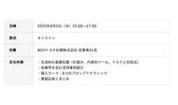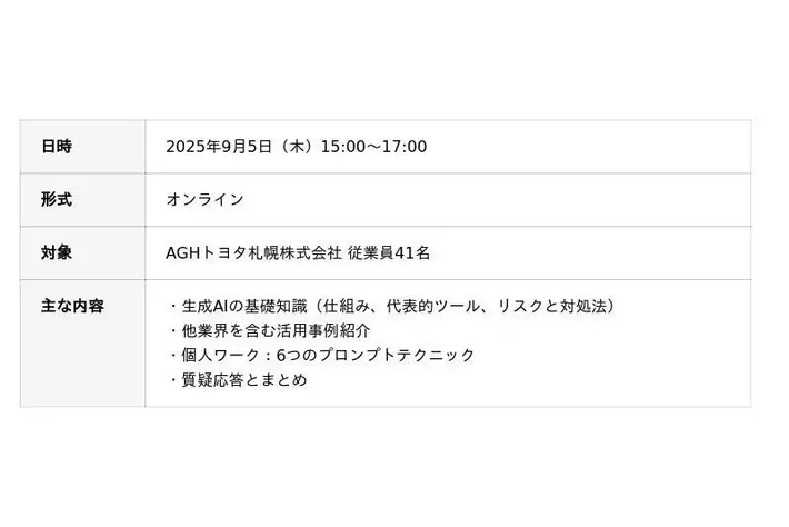 株式会社TENHO(本社:東京都渋谷区、代表取締役:田村 允/土田 龍矢、以下「当社」)は、2025年9月5日(木)、AGHトヨタ札幌株式会社(本社:北海道札幌市、代表取締役社長:西川 友晴、「以下「AGHトヨタ札幌」)の従業員を対象に、生成AI活用の基礎に関するオンラインセミナーを実施しました。本セミナーは、東武トップツアーズ株式会社(本社:東京都墨田区、代表取締役:百木田 康二、以下「東武トップツアーズ」)との共同開催により実現したものです。