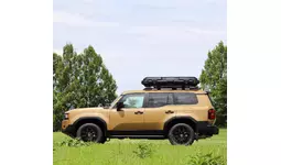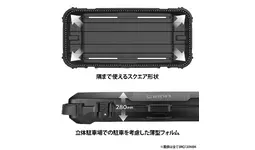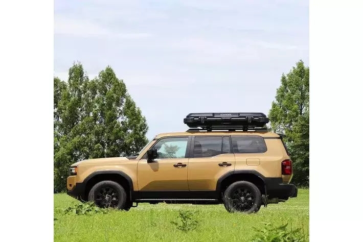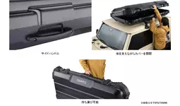 これまでの流線型やシンプルなデザインのルーフボックスとは異なり、クロカンSUVの車両イメージに合わせて無骨なデザインに。凹凸を施したカバーは、ボックスの強度をアップしながら堅牢さと力強さを演出します。