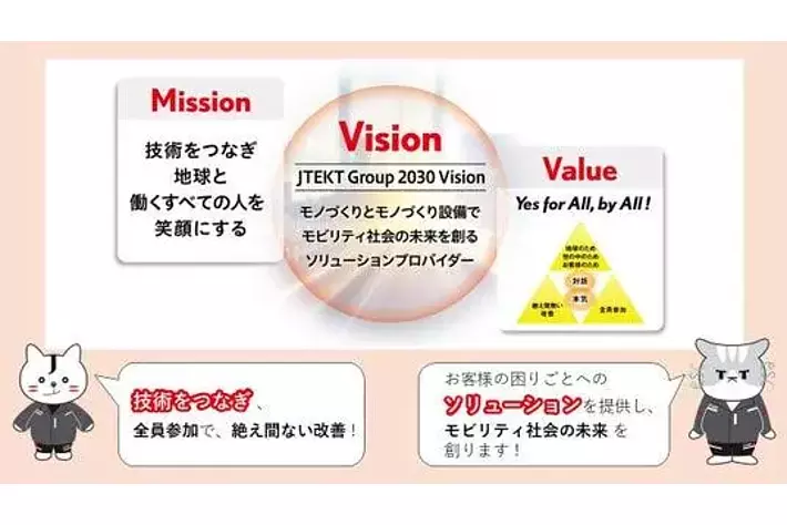 ジェイテクトは、「技術をつなぎ、地球と働くすべての人を笑顔にする」というミッションに基づき、2030年までに目指す姿としてJTEKT Group 2030 Vision「モノづくりとモノづくり設備でモビリティ社会の未来を創るソリューションプロバイダー」を掲げています。このソリューションプロバイダーへの変革のために、既存製品の高付加価値化と新領域へのチャレンジの両軸での成長と変革を目指しています。