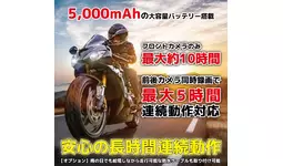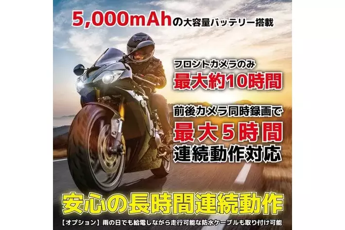 長時間のツーリングに対応5000mAhの大容量バッテリーを搭載し、前後同時録画でも最長約5時間の連続撮影が可能。安心して長距離のツーリングを楽しめます。※前方カメラ撮影のみの設定では最長約10時間の連続撮影が可能。
