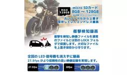衝撃検知録画Gセンサー内蔵で、突然の衝撃や事故での衝撃を本体が受けたときに、作成される動画ファイルについては通常の上書き対象のファイルとは別に上書きから保護されたロックファイルを作成します。万が一の際にも証拠となる映像ファイルを上書きから自動で保護することができます。