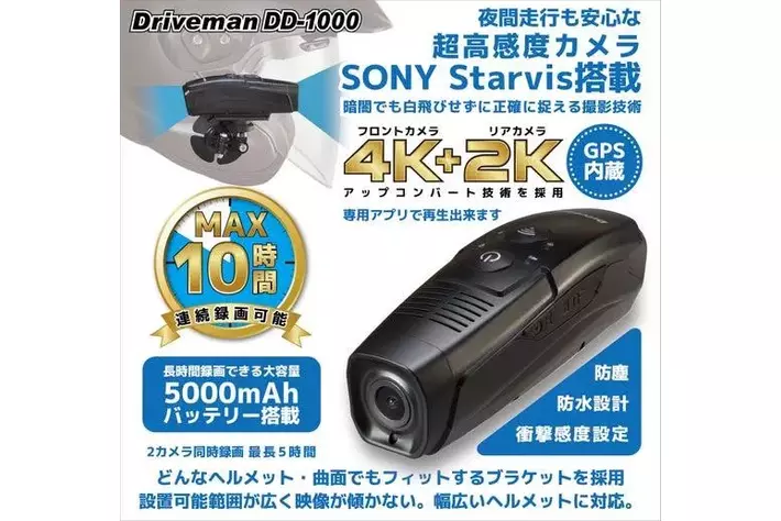 秋のツーリング、前方・後方の“死角”と“暗闇”を撃退。前後同時録画・超高感度センサー搭載ヘルメットカメラ「Driveman DD-1000」、プライム感謝祭に登場。