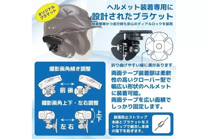 幅広いヘルメットに対応。さまざまな曲面でも取り付け可能なブラケットクローバー型の貼り付け面は、羽部分が折り曲げることができ、しっかりと曲面を捉えて強力な両面テープで固定できます。自由度の高い可動ジョイントで撮影画角を調整できます。