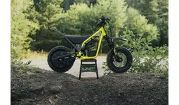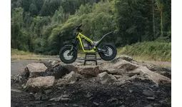 軽量スチールフレームを採用し、トライアル仕様で重量はわずか22.7kg。持ち上げやすく、操作やコントロールも容易です。シート高はトライアルモードでわずか360mm、XPloreモードで445mmと低く設定されているため、小さなライダーでも両足をしっかりと地面に着けることができます。子どもの手に合わせたグリップやショートリーチのブレーキレバーにより、快適な操作が可能です。コンパクトなシャーシはホイールベース675mm、最低地上高152mm、ハンドル高650mmで設計されており、小柄なライダーに安定性と低速域での扱いやすさを提供します。さらにフロントには50mmフォーク、リアにはリバウンドおよびプリロード調整可能な60mmコイルショックを装備し、成長に合わせて調整できます。