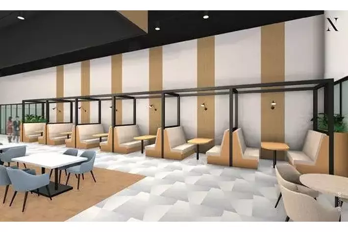 お客様にゆったりとお過ごしいただけるよう、空港のラウンジのような落ち着いた雰囲気を持たせ、高級感のあるデザインに仕上げています。カフェは様々な種類のお飲み物をご用意しており、商談スペースやラウンジスペースへ自由にお持ち込みいただけます。