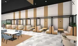 お客様にゆったりとお過ごしいただけるよう、空港のラウンジのような落ち着いた雰囲気を持たせ、高級感のあるデザインに仕上げています。カフェは様々な種類のお飲み物をご用意しており、商談スペースやラウンジスペースへ自由にお持ち込みいただけます。