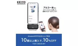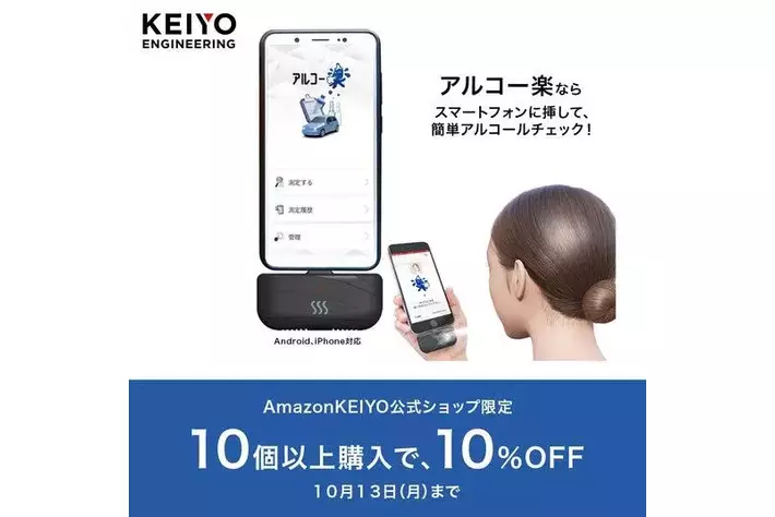 慶洋エンジニアリング(東京都港区新橋)業務用アルコールセンサー「KEIYOアルコー楽」が、社用車の台数分まとめて導入しやすいお得なキャンペーンを開催中!スマートフォンに挿して息を吹きかけるだけで簡単にアルコールチェックができ、測定データは無料のスマホアプリやPCソフトで管理可能。顔写真記録機能でなりすましも防止でき、義務化対応をスマートに実現します。今ならAmazon限定で、10個以上の購入で10%OFF!キャンペーンは10月13日(金)まで。