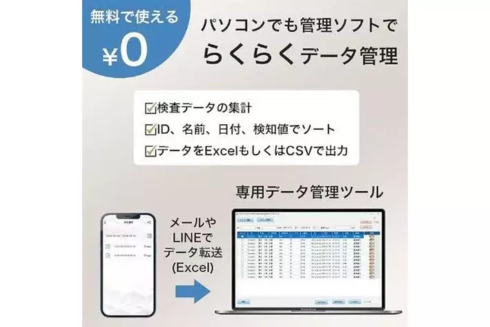 【無料アプリで簡単データ管理】専用のスマホアプリは無料でお使いいただけます。 測定結果はイラスト付きで一目で分かりやすく、測定履歴から、LINEやメールで管理者にエクセルファイルで送ることができるのでデータ管理に時間をとられません。 ※アプリは事前にダウンロードしてください