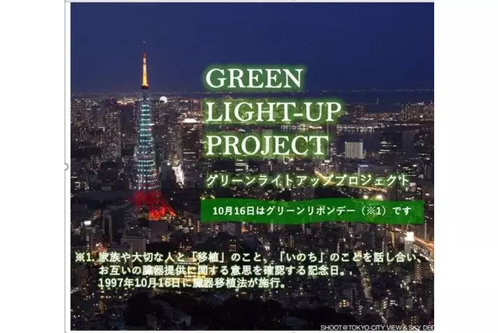 臓器移植医療への理解促進を願って、趣旨に賛同する企業等がグリーンリボンデー※1(10月16日)を中心に、全国各地のランドマークやビル等をグリーン(移植医療のシンボルカラー)にライトアップするプロジェクトです。