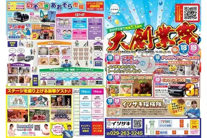 茨城県ひたちなか市を拠点に自動車販売・整備を手がける イソザキ株式会社(本社:茨城県ひたちなか市、代表取締役:磯崎拓紀)は、お客様そして地域の皆さまへの感謝を込めた年に一度の恒例イベント 「イソザキ大創業祭2025」 を、2025 年10 月18 日(土)・19 日(日)の2 日間、本社敷地内で開催します。