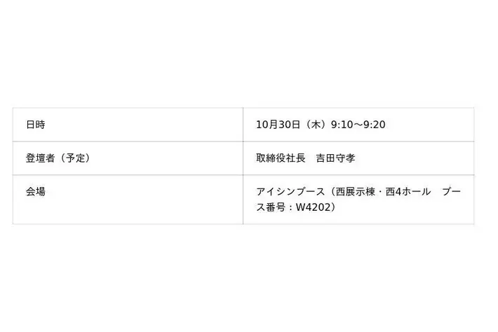 株式会社アイシン(本社:愛知県刈谷市、取締役社長:吉田 守孝)は、一般社団法人日本自動車工業会が主催する「Japan Mobility Show 2025(ジャパンモビリティショー)」(一般公開:10月31日~11月9日、東京ビッグサイト)に出展します。