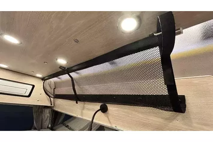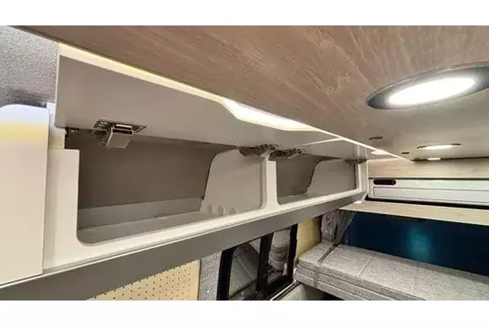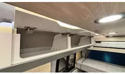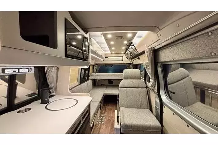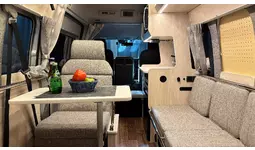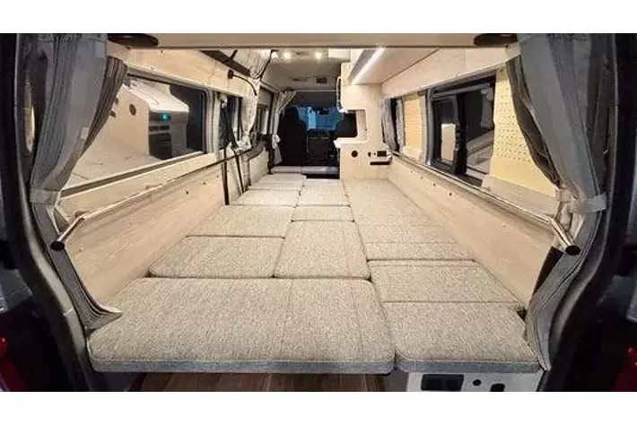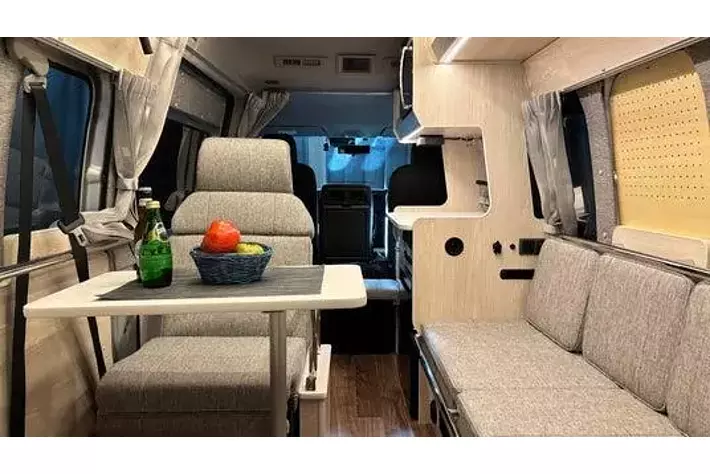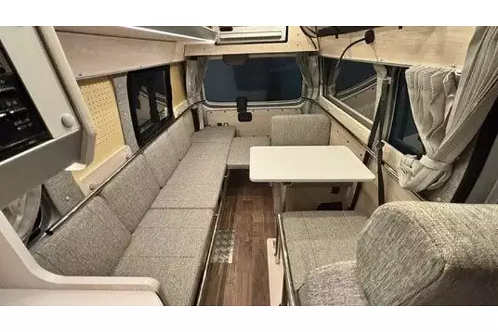 内装:3人掛けシート(2点式シートベルト)、1人掛けマルチシート(3点式シートベルト)、エクステンションマット、床面クッションフロア仕上げ、カーテン、吊戸棚、着脱式テーブル、タオルハンガー、バックドア木目トリム(LED付)