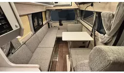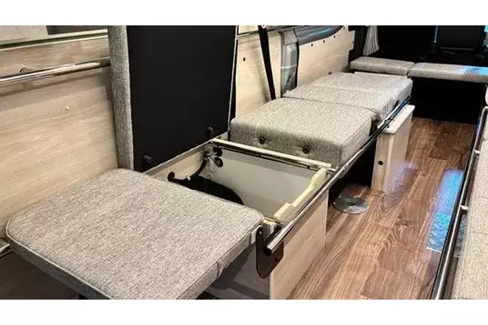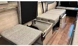 エントランス入ってすぐ右手に前向き、後向き、フラットモードになる1人掛けマルチシートが設置されています。ひじ掛けも付いて快適です。横向きの3人掛けシートは2点式シートベルト付。すべてのシートをフラットにすれば大人2人と子供1人が就寝できる広々としたスペース(長さ2300mm×最大幅1500mm)に早変わりします。マルチシートを後向きモードにすれば、サードシートと対座になるダイネットが完成。着脱式テーブルを移動させれば横向き3人と合わせて5名でテーブルを囲むことができます。