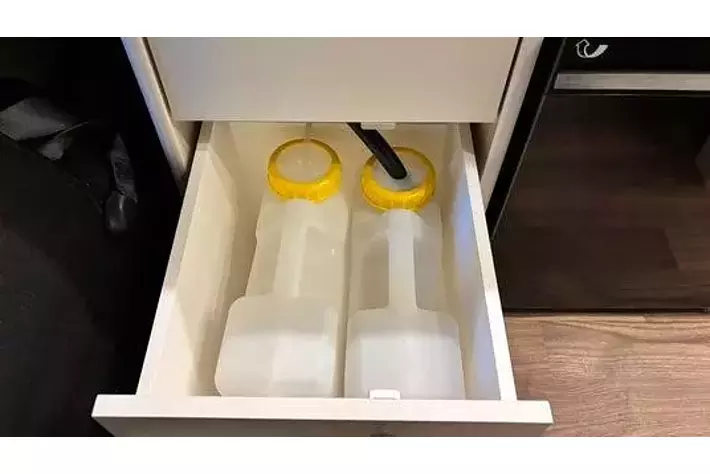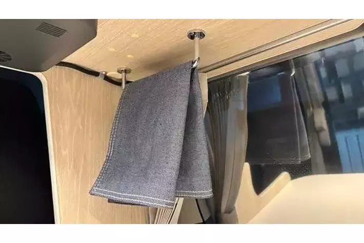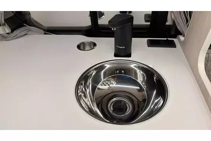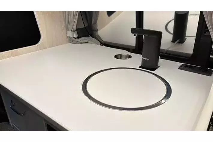 丸型シンクには蓋がついており、使用しない時はスペースを広く有効活用できます。マグネット式ポータブルウォータータップは取外し可能なので車外で使用することもできます。調理カウンターの上部にはタオルハンガー、電子レンジ、下部には58Lの冷蔵庫、収納スペース、清水タンク・排水タンク(各12L)を完備し、料理しやすい環境を整えました。