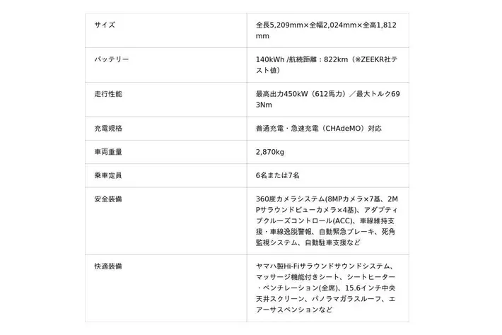 140kWhの容量を持つCATL製の第3世代バッテリー「Qilin」が搭載され、航続距離は822km(ZEEKR社テスト値)を記録しています。前後デュアルモーターによる最大出力は450kW(612馬力)、最大トルク693Nmを発揮。車重は2870kgにもかかわらず、0-100km/h加速わずか4.5秒という驚異的な動力性能を実現しています。