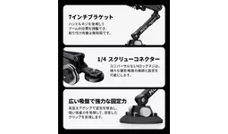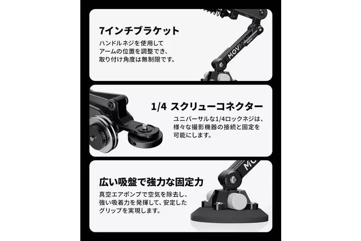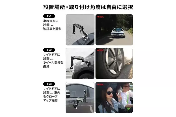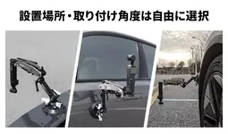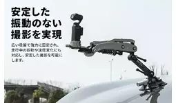 本製品は持ち運びが簡単なコンパクトさでありながら、車やバイクなどに強力な吸盤を使って取り付けができます。走行時の振動は衝撃吸収機構で効果的に抑え、激しい動きや荒れた地形でも滑らかな映像撮影を可能にします。