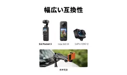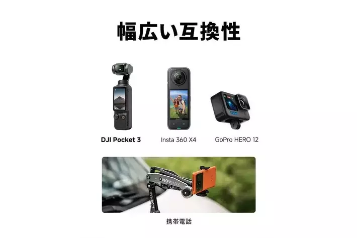 1/4インチネジ穴を備え、様々なカメラ機器を簡単に装着可能。DJI Osmo PocketシリーズやGoPro、Insta360などのアクションカメラから、スマートフォンまで、幅広い機材に対応します。