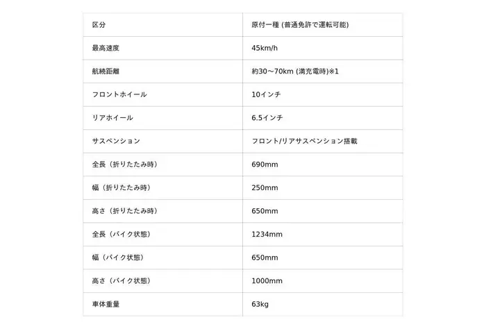 ※1 使用バッテリー仕様・走行条件(体重、路面、気温、速度など)により変動します。標準バッテリー搭載時は最大約30km、オプションバッテリー搭載時は最大約70kmの走行が可能です。