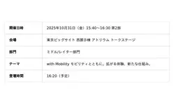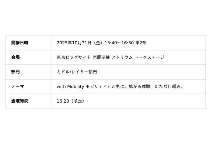 Japan Mobility Show 2025は、一般社団法人日本自動車工業会が主催する国内最大級のモビリティイベントです。今回、ユビ電は予選を通過し、ミドル/レイター部門の決勝進出15社に選出されました。「with Mobility モビリティとともに。拡がる体験、新たな仕組み。」のテーマで登壇し、マンション向けEV充電サービス「WeCharge」を通じた、新しいEVライフの実現について発表します。