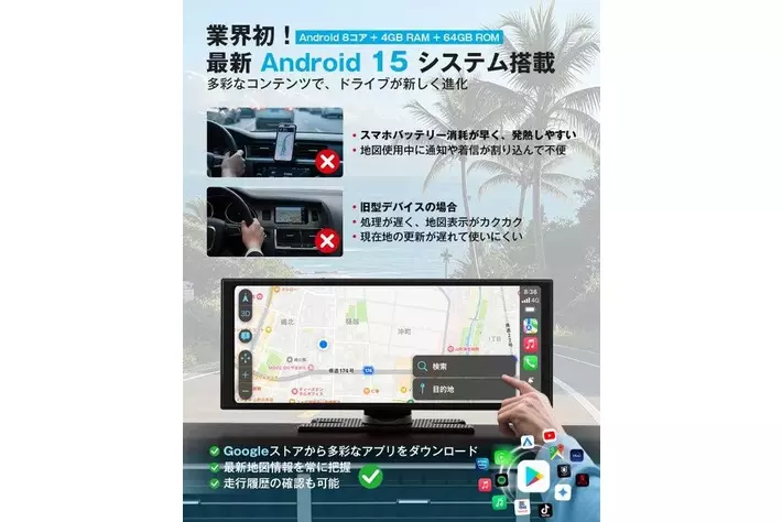 本商品は、ディスプレイのない車や中古車でも、配線工事なしで設置でき、ワイヤレスCarPlay/Android Auto に対応。高解像度ディスプレイと分割表示機能で、ナビもエンタメも一画面でスムーズに楽しめます。さらに、最新のAndroid 15を搭載し、お気に入りのアプリを自由にダウンロードして、自分だけのエンタメ空間をカスタマイズできます。