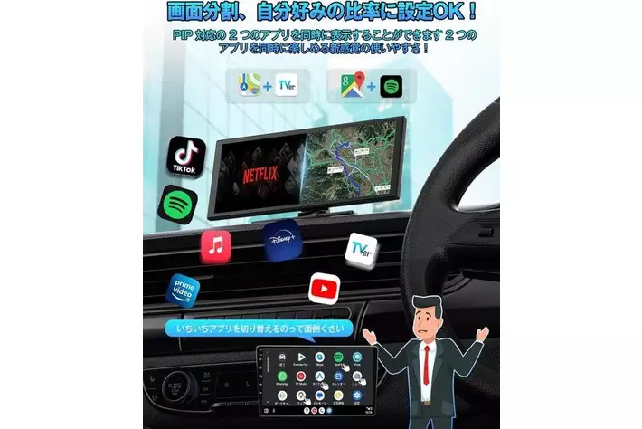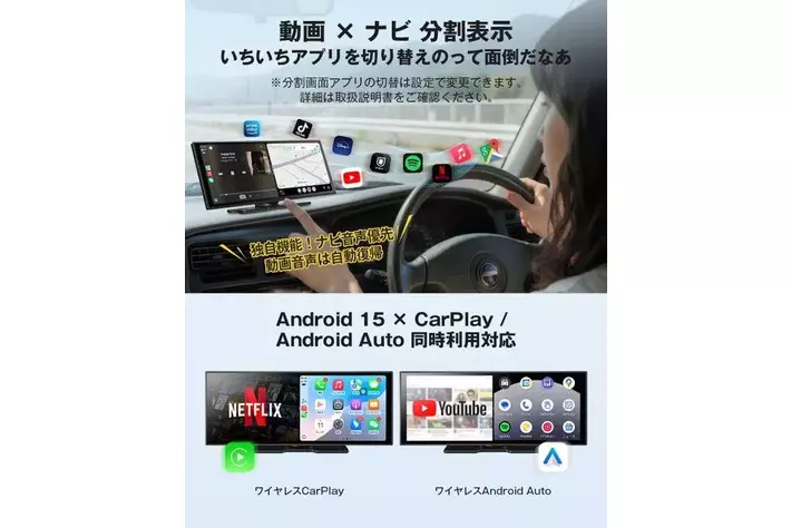 片側にCarPlay/Android Auto、もう片側にYouTubeやNetflixなどを同時表示可能。