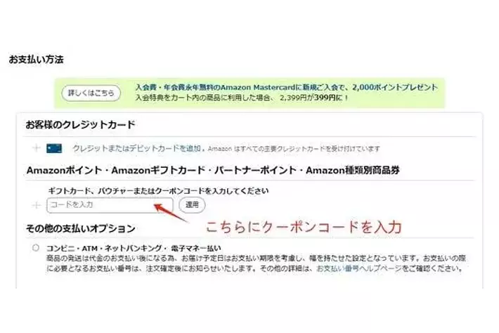 注文を確認するのページ上で、「ギフトカード、バウチャーまたはクーポンコードを入力してください」の場所で、割引コードを入力すればよろしいです。