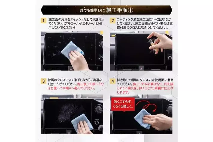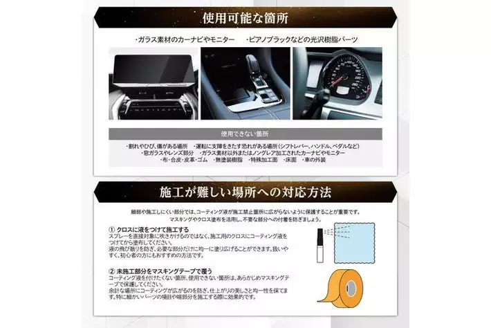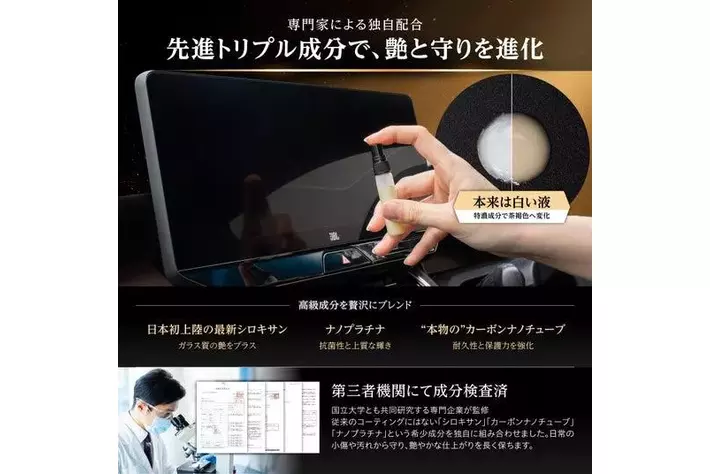 “艶と光沢を塗るだけでアップ”をコンセプトに、専門企業監修による高品質な処方を採用。カーナビやシフトパネルなどの内装パーツを、小傷・指紋・ホコリから守りながら、新車のような艶を簡単に再現できる車内装専用のコーティング剤です。