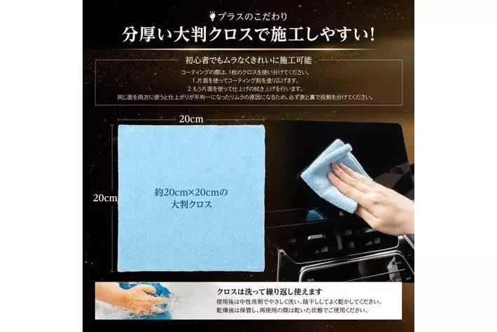 付属の大判クロス(約20cm×20cm)を使って、塗って拭くだけの簡単ステップ。初心者でもムラなく施工でき、1本で普通車約10回分の施工が可能です。