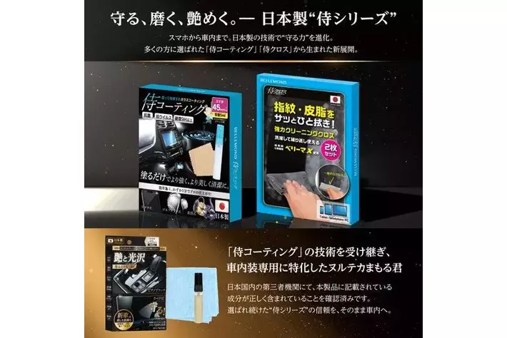 BELLEMONDの人気シリーズ「侍コーティング」で培った技術を継承し、車内装専用に特化させたのが本製品「ヌルテカまもる君」。国内第三者機関での成分検査も完了しており、信頼できる品質で“愛車を長く美しく守る”ケアを提供します。