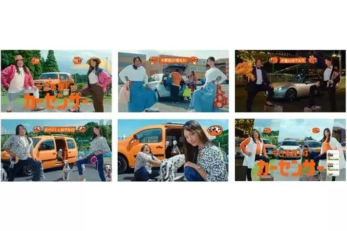 本CMでは、これまで出演していた菜々緒さん、秋山さんに加え、あのさんを新たに起用。3人の共演は初となります。今回公開となる4篇のうち、3人が共演する「ナナオとナナエとあのちゃん ボクもほしい」篇では、ショッピングモールの駐車場にいるナナオとナナエの前に、姉妹のかっこいい車に惹かれたあのさんが登場。「ボクも車欲しい…」と呟くと、姉妹は『カーセンサー』での条件検索をあのさんに教えます。欲しい中古車が見つかった、と思いきや、「免許も欲しい」と言うあのさん。「え?」と姉妹が反応に困り固まっていると、「くれ」とあのさんがぼそっと一言。姉妹は思わず驚愕の表情を浮かべます。「ナナオとナナエとあのちゃん はじめての中古車探し」篇では、あのさんが欲しい中古車が見つかると…、ラストはダンスと歌を披露!あのさんがぼそっと呟く一言や表情によって、不思議なペースに引き込まれる3人の様子は必見です。「中古車探し娘。」篇では、車内でテレビをつけたナナオの目に飛び込んできたのは、なんと音楽番組に“中古車探し界の新生アイドル”「中古車探し娘。」として出演するナナエ! 「中古車探しはカー・カー・カーセンサー♪」という歌詞に合わせて、まさに文字通り踊りまくります。「お姉さま、見てる~?」と手を振っているナナエに、思わずナナオも一緒に歌ってしまいます。多くの人たちに耳なじみのある「モーニング娘。」の「LOVEマシーン」のメロディーで、見る人がノリノリになれるCMです。