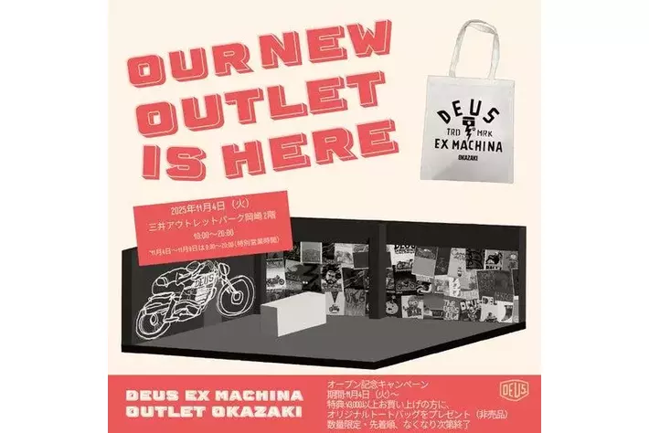 シドニー発、世界展開するライフスタイルブランド「DEUS EX MACHINAデウス エクス マキナ」が、2025年11月4日(火)、三井アウトレットパーク岡崎に国内初のアウトレット店舗をオープンします。