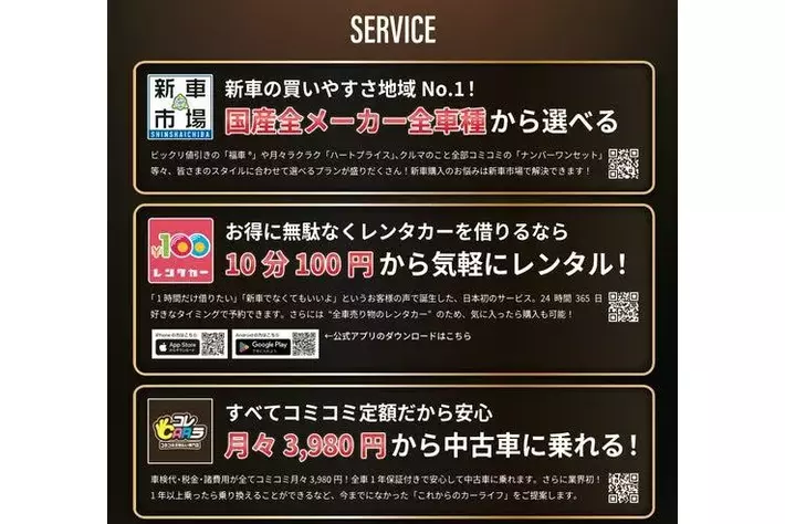 車業界の100円ショップ。「10分だけ借りたい」「短時間利用なのに長時間分払うのがもったいない」「新車じゃなくてもいい」など、ニーズに応えて誕生した日本初の新発想レンタカーサービスです。ホームページから実車予約できる業界初のシステムを導入し、短時間利用を実現。さらに全車が売り物のため、レンタルをきっかけに購入も可能。年間800台以上が購入につながっています。