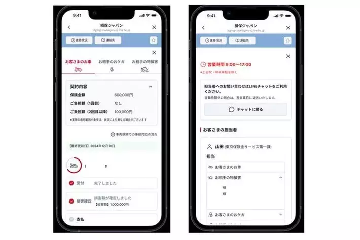事故の連絡をしてから保険金支払いまでの進捗状況や契約内容の確認機能をLINEに集約し、お客さまがご都合の良いタイミングで保険手続きの状況を手軽にご確認いただける業界初※2の取組みです。