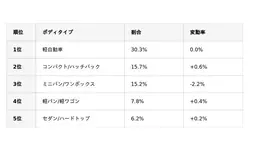 国産車のボディタイプ別ランキングでは、軽自動車が変わらず1位を維持しています。9月はミニバン/ワンボックスが2.2ポイントもシェアを落としており、コンパクト/ハッチバックと順位が入れ替わっています。