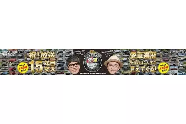 ポスターデザインには、おぎやはぎお二人のメッセージに加え、番組内で過去に登場した一部の車がズラリと並びます。