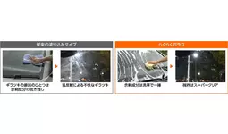 『らくらくガラコ』は新型ワイドヘッド搭載の新容器を採用。約84mm×43mmサイズのワイドヘッドは塗り込み時の往復回数が減ることで疲れにくく、塗り込み時間も約25%短縮。施工時にガラスとボディの境目にコツコツと当たる問題を解消したボディに優しいホルダーレス構造を採用。さらにフェルトが見えることで塗り残しも起こりにくくなるほか、両端が尖った独自形状によりコーナー部の塗り残しも防ぎます。