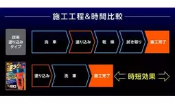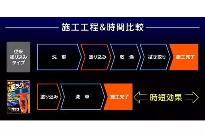 『らくらくガラコ』は従来の塗り込みタイプによくある洗車後に施工して乾燥待ちをし、余剰成分を拭き取るのではなく、洗車前に先に塗り込んでそのままシャンプー洗車をすることで、乾燥待ち時間実質ゼロ・拭き取りも不要となり、施工工程と時間が大幅に短縮できる“速ラク施工”を実現しました。