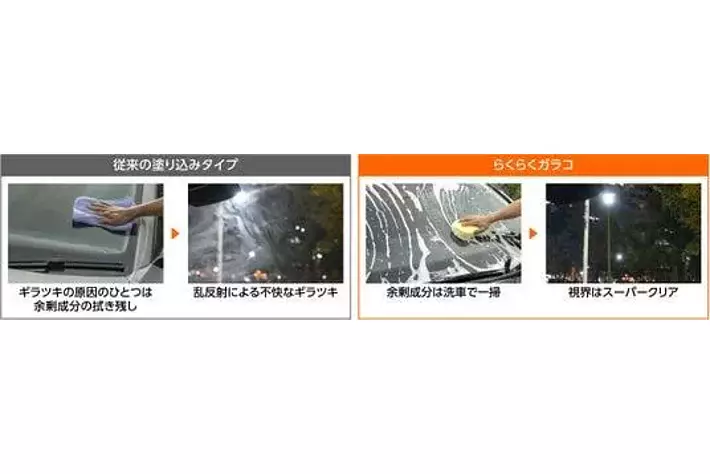 従来の塗り込みタイプでは施工時の拭き残しにより、乱反射で不快なギラツキが起こることがありました。『らくらくガラコ』は、先に塗ってシャンプー洗車で仕上げるため、余剰成分は一掃され、視界がスッキリクリアに仕上がります。ガラス撥水剤はギラツキが苦手と敬遠している方やガラス撥水剤を初めて施工いただく方にもおすすめです。