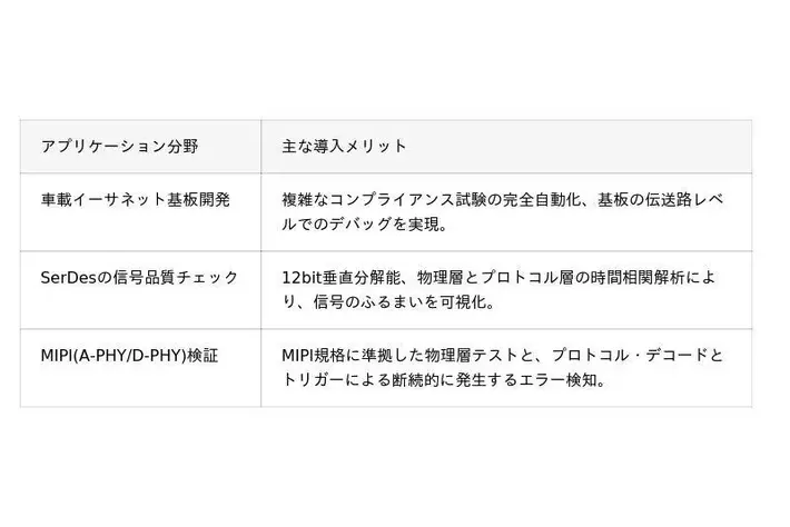本ソリューションは、高機能・高精度なオシロスコープと高速インターコネクトアナライザーであるTDR、さらに自動テストソフトウェアを組み合わせた統合テストソリューションです。ADAS(先進運転支援システム)やコネクテッドカーの進化に不可欠な車載ネットワークの開発・製造において、単なる規格の合否判定にとどまらず、不合格の根本原因を迅速に特定する高度なデバッグ機能を提供します。これにより、エンジニアの開発プロセスを効率化し、次世代自動車の品質の向上と市場投入の加速に貢献します。