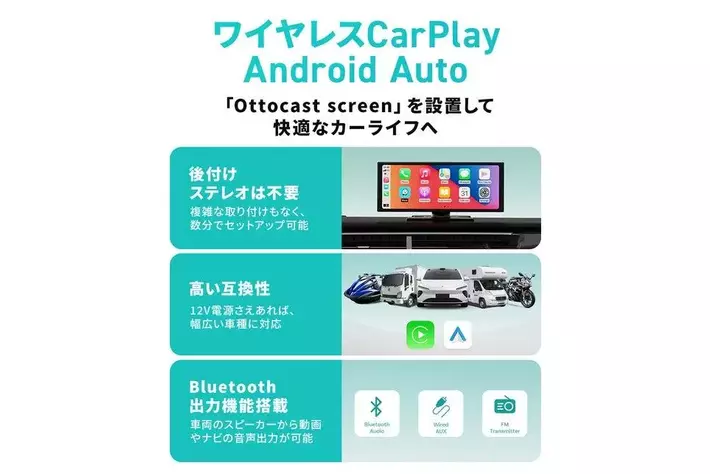 どちらも車両にUSB接続するだけの超カンタン仕様で、すぐにワイヤレスCarPlay/Android Autoが利用可能に。普通車はもちろん、旧車やトラック、キャンピングカーなど幅広く対応しています。