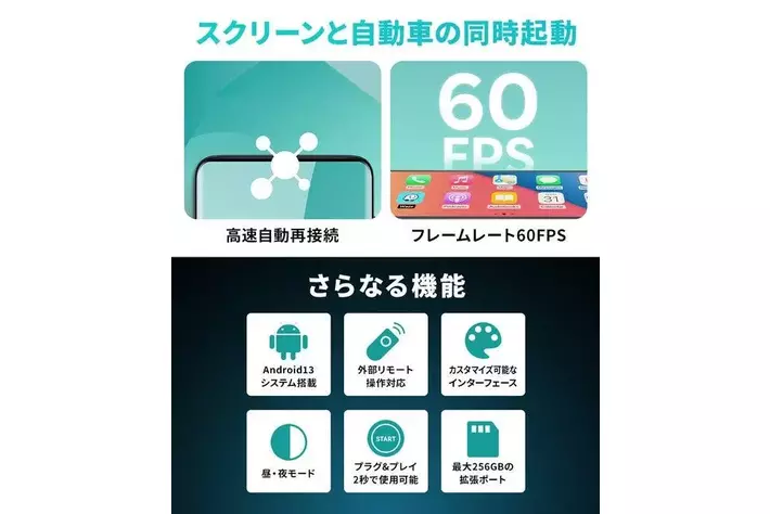 本製品には8コアCPU+4GB RAM+64GB ROMが搭載されており、快適な動作を実現しました。マルチタスクにも対応し、複数アプリの同時利用でもストレスを感じさせません。車両スピーカーとの連携機能や自動再接続機能も備え、シームレスな操作性とともに未来のカーライフをお届けします。