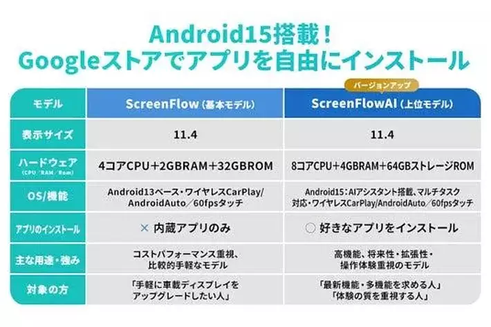 「ScreenFlow AI」は、Android 15を搭載し、Google PlayからYouTube・Netflix・地図アプリ・音楽・ゲームなど自由にインストール可能な多機能モデル。Gemini AIと連携することで、音声による自然な会話操作も可能になります。