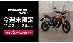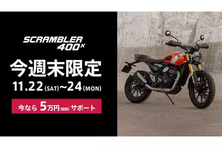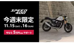 トライアンフモーターサイクルズジャパン株式会社(本社:東京都港区海岸 代表取締役社長:大貫陽介)は、全国のトライアンフ正規販売店にて、11月中の週末3回にわたり、「週末限定5万円サポート」が実施される、スペシャルウィークエンドキャンペーンの詳細をお伝えします。