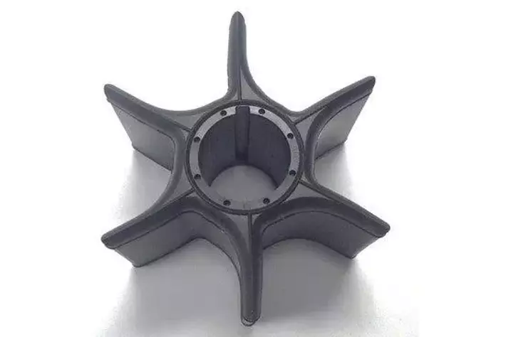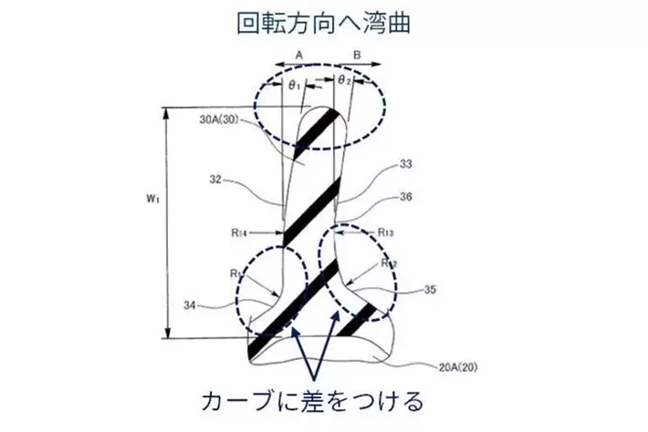船外機の冷却水をエンジンに循環させるポンプ内に設置され、冷却水の流れをスムーズにする部品「インペラー」の形状設計に関する発明です。インペラーの羽根を回転方向に湾曲させた形状にするとともに、羽根の根元部分のカーブを回転方向側と逆側とで非対称に設計しました。これにより、羽根が滑らかに動きやすくなり、特に破損しやすい根元部分へひずみが集中することを抑制しています。本形状を用いることで、インペラーの耐久性が向上し、ポンプ性能を安定的に維持することが可能になりました。