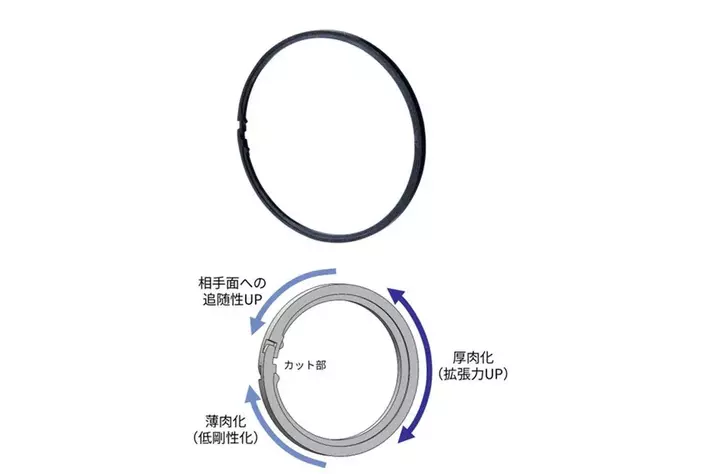 自動車のオートマチックトランスミッション(AT)や無段変速機(CVT)において、油圧を保持するために使用される回転用シールリングの形状設計に関する発明です。オイル漏れを低減するために、非対称(三日月)の形状に設計しています。シールリングの接合部周辺は厚みを薄くして剛性を抑え、反対側は厚みを持たせることで拡張力を高めています。この形状により、シールリング外周面に生じる隙間を低減し、ハウジングとの密着性が向上することで、最大80%のオイル漏れを低減します。高い密封性と耐久性を活かし、油圧の安定性を向上させ、異物の噛み込み防止にも効果を発揮します。