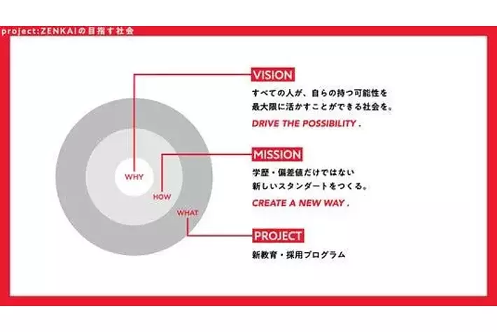 project:ZENKAI(以下、ZENKAI)は、「すべての人が、自らのもつ可能性を最大限に活かすことができる社会を実現する」をビジョンに掲げ、従来の教育・採用活動が指標としてきた“学歴や偏差値”といったひとつの物差しではなく、一人ひとりが持っている可能性に焦点をあて、対話と実践を通じて、「お互いの可能性を信じて、応援し合える」仲間づくりを行っているプロジェクトです。
