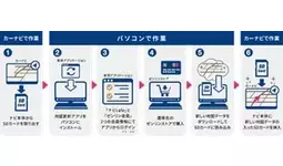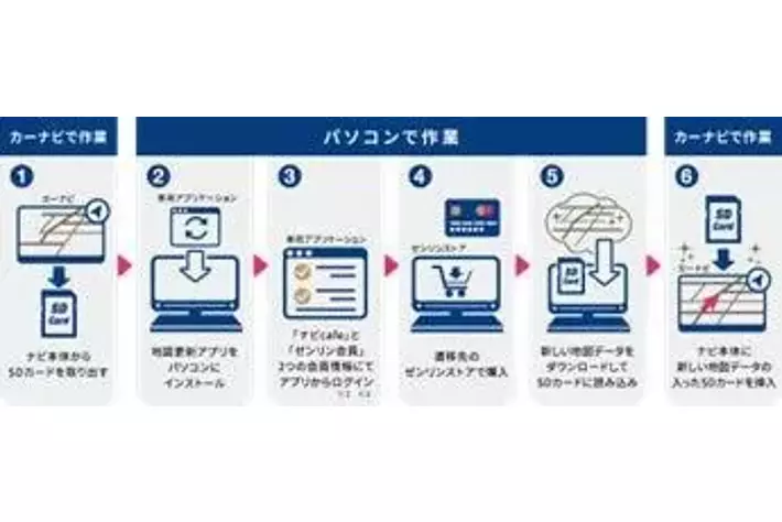 カーナビ本体からSDカードを取り出し、PCにインストールした地図更新アプリから新たなデータをダウンロードのうえSDカードに読み込み、ナビ本体に挿入することで更新が完了します。