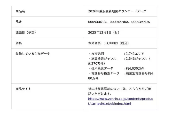 株式会社ゼンリン(本社:福岡県北九州市、代表取締役社長:竹川道郎、以下ゼンリン)は、パナソニックのカーナビゲーション「Strada(ストラーダ)」のうち、ゼンリンの地図データが採用されている2014年秋発売モデル以降の機種(※1)を対象としたダウンロード版更新地図、「2026年度版更新地図ダウンロードデータ」の販売を、2025年12月1日(月)より、ゼンリンのオンラインショップ「ZENRIN Store」にて開始します。価格は13,090円(税込)です。なお、メディア版はパナソニック オートモーティブシステムズ株式会社から販売(※2)されます。