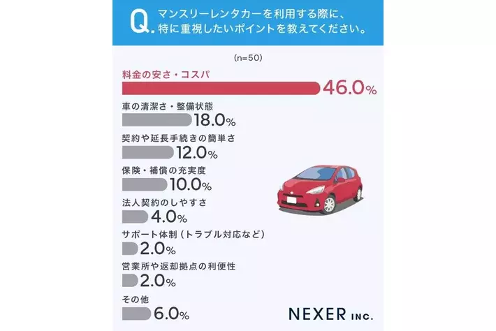 ■46%が、マンスリーレンタカーで重視したいポイントは「料金の安さ・コスパ」と回答